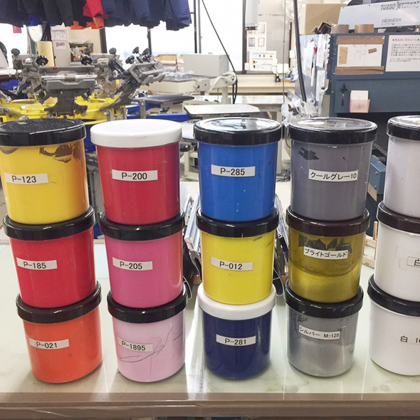 実際にTシャツの生地にプリントするインクです。種類も様々で基本カラーは50色!そのほかの様々な特殊カラーを含めるとなんと1000色以上!!お客さまからのニーズやイメージに極めて近いカラーに仕上げれるのもラブラボの一つの強みです。