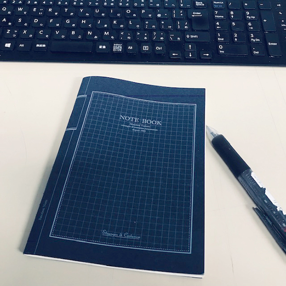 「マイノート」マイミッションにもあるように、現在インクジェットプリントに携わっております。新しい部署での新しい作業なので、かなりのメモ魔になっています。というわけで、このノートが今の私のこだわりの仕事道具です。