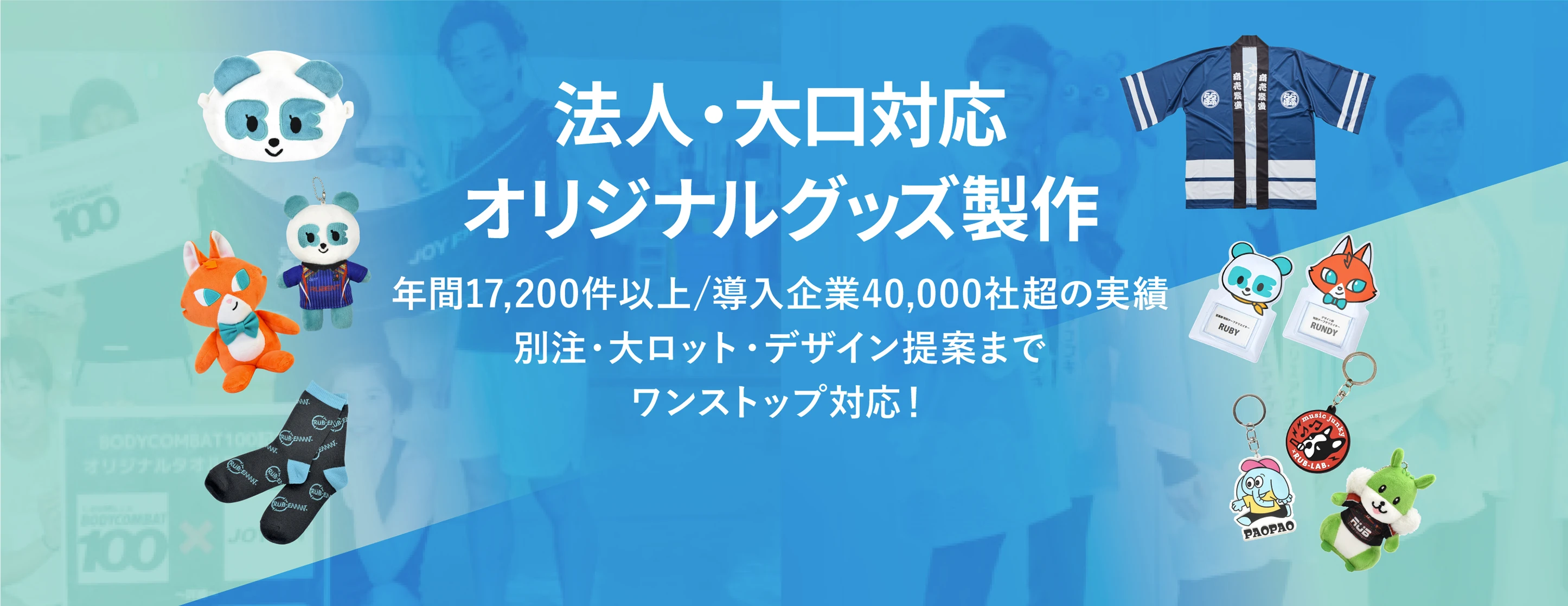 年間17,200件以上の法人案件に対応した実績と、確かなモノづくり体制で、企画・デザイン提案から製造・納品までをワンストップでサポートします。