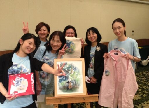 お祝いの会では参加者の方々が絵と共に、ディスプレーした絵画そのままにプリントされたそれらの品々を手に取り、記念撮影をしておられました。