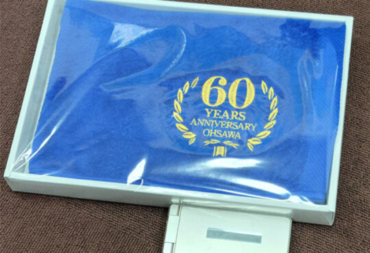 タオルに60周年のデザイン刺繍が、高級感がある素敵な記念グッズです!