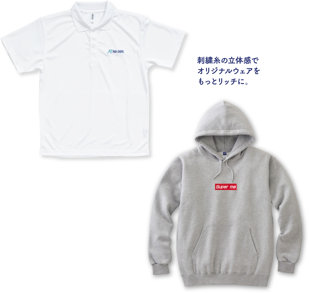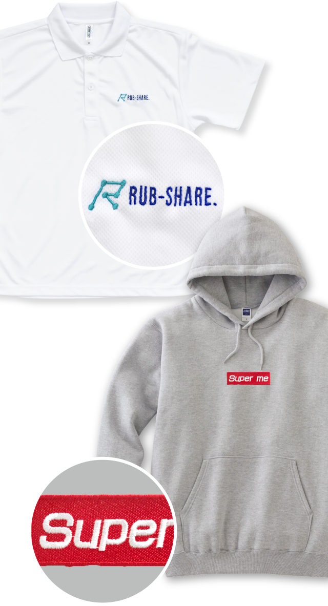 刺繍糸の立体感でオリジナルウェアをもっとリッチに。 ツヤのある糸でウェアやタオルに刺繍を入れることができます。
