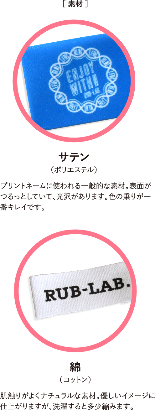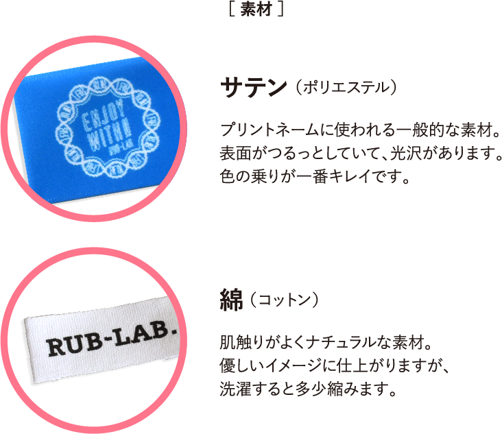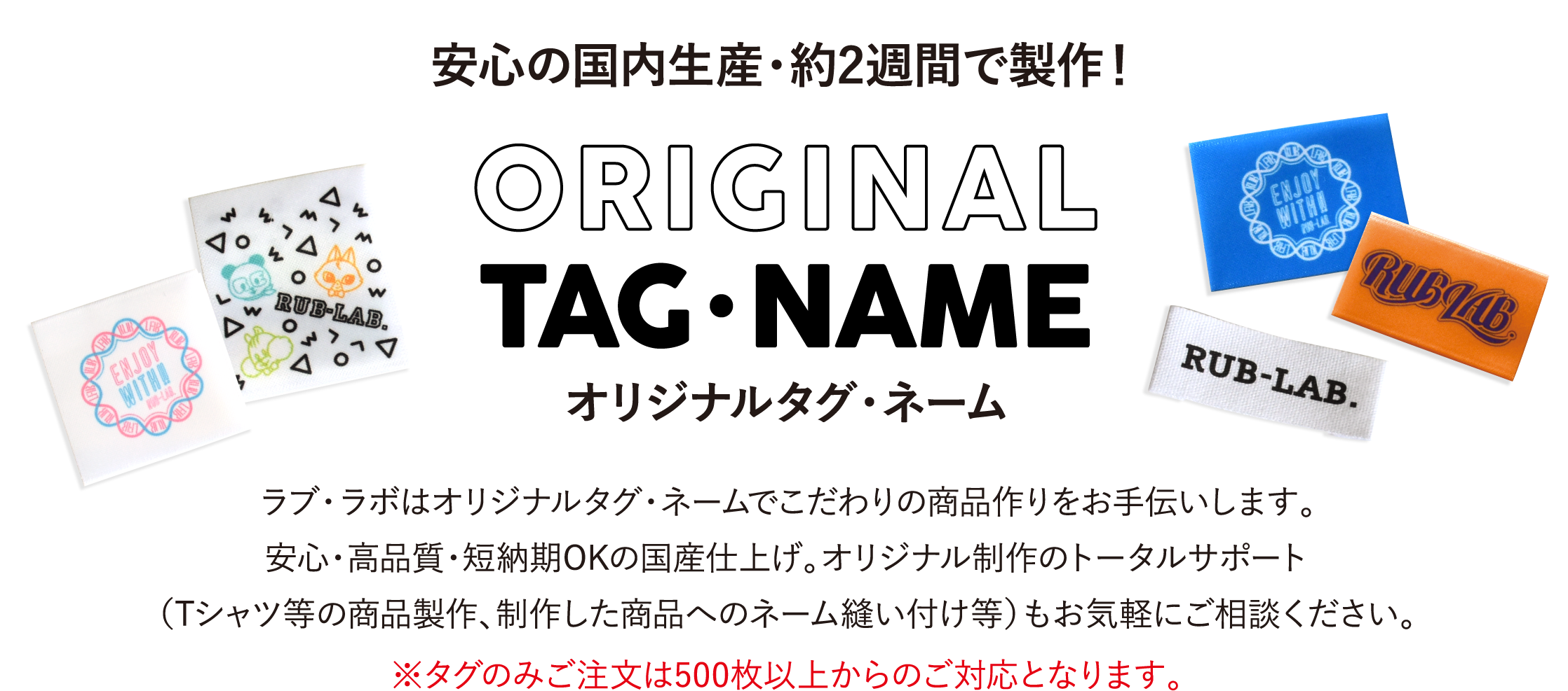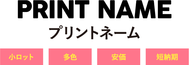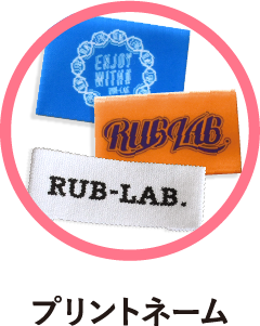 プリントネームは生地にロゴデザインなどを印刷したネームタグです。高価な版を作る必要がなく多色印刷できるため、小ロットを安価で作成できます。イラストや写真、グラデーションなどの表現が自在に実現できることも魅力です。また、織ネームよりも短納期なのもプリントネームのおすすめポイントです。
