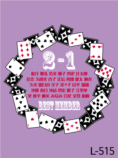 オリジナルTシャツトップ デザインガイド デザインテンプレート集 a_11 L-515 トランプがオシャレな感じを引き出してくれるよ!ちょっとメルヘン! #クラスTシャツ #個人名 #クラスTシャツ #ベーシック #トランプ #メルヘン #クラスTシャツ #円 #カード #ハート #ダイヤモンド #クローバー #スペード # 配色例 C-25 C-21 C-22 ※背景色は配色例に含まれておりません。 ※モニター上の環境設定により実際のインクと違う場合がございます。 お問合せをする CATEGORY オリジナルTシャツ デザインテンプレートカテゴリー クラスTおそろい クラブ・部活・スポーツ 音楽バンド 文字 動物 エンブレム・ワッペン イベント・行事 職業 タオル アイドル・アーティスト・応援 その他 デザインシミュレーターを 使ってみよう! フォントのイメージはデザインシュミレーターを使って簡単に確認できます。 PCでもスマホからでもOK。 実際に気に入った書体・フォントを入れ込んでイメージを確認してみましょう。 \ 書体でお困りなら / 書体一覧はこちら \ デザインがお決まりなら / デザイン入稿フォームはこちら ご注文・お問い合わせ方法