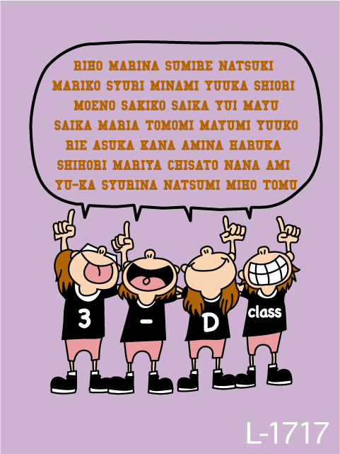 オリジナルTシャツトップ デザインガイド デザインテンプレート集 s_15 L-1717 クラス名とクラス全員の名前が入るデザイン。仲良し四人組がクラスの雰囲気を盛り上げます。 #クラスTシャツ #ベーシック #ポップ #キャラクター 配色例 C-21 C-22 C-40 C-68 C-61 ※背景色は配色例に含まれておりません。 ※モニター上の環境設定により実際のインクと違う場合がございます。 お問合せをする デザインシュミレーターで確認してみる HISTORY 最近チェックしたデザイン CATEGORY オリジナルTシャツ デザインテンプレートカテゴリー クラスTおそろい クラブ・部活・スポーツ 音楽バンド 文字 動物 エンブレム・ワッペン イベント・行事 職業 タオル アイドル・アーティスト・応援 その他 デザインシミュレーターを 使ってみよう! フォントのイメージはデザインシュミレーターを使って簡単に確認できます。 PCでもスマホからでもOK。 実際に気に入った書体・フォントを入れ込んでイメージを確認してみましょう。 \ 書体でお困りなら / 書体一覧はこちら \ デザインがお決まりなら / デザイン入稿フォームはこちら ご注文・お問い合わせ方法
