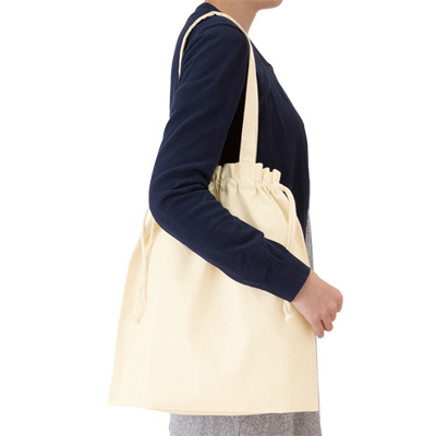 厚手コットンガゼット巾着L(TR0872)は、生地の目が詰まった5オンスの厚みで、中身が透けにくいのにしなやかな素材なのが特徴。口がキュッと閉まったフォルムが可愛らしさがあってカジュアルにもキュートにも使えます。シンプル過ぎないのでコーディネートのアクセントととしても。