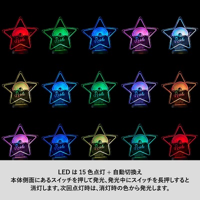 消→レッド→グリーン→ブルー→ピンク→ホワイト→イエロー→ライトブルー→ライトグリーン→パープル→オレンジ→ライトピンク→アクアブルー→ライトイエロー→ダークグリーン→ライトレッド→自動切換え→消