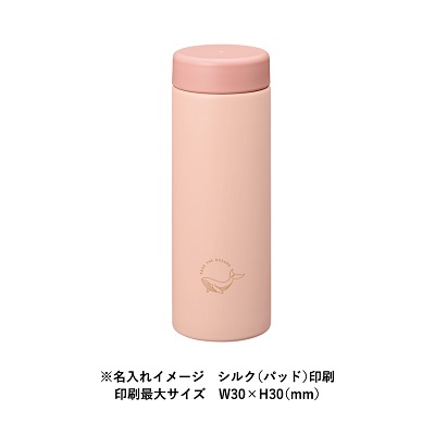 同型で300ml容量ボトルもございます。保温保冷に優れた真空二層構造で、季節を問わずお使いいただけます。回転シルク印刷で側面にほぼ全面に印刷が可能なのでキャラクターやアーティストの物販品、特別な記念品などにもおすすめです。