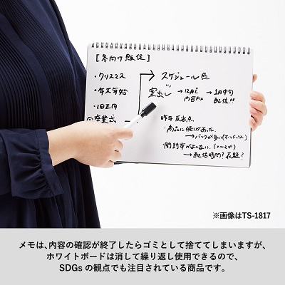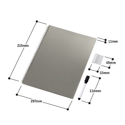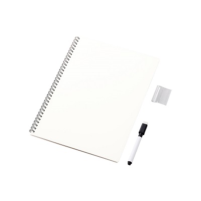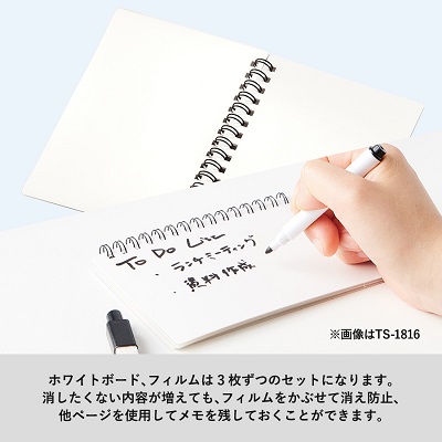 ペンループが付属しているので、好きな箇所に張り付けてペンを入れて持ち歩くことができます。ホワイトボードフィルムが3枚セットになっているので、消したくない内容が増えても、フィルムをかぶせて消え防止、他ページを使用してメモを残しておくことができます。何度も書いたり消したりできるため、ごみが出ないエコ商品になります。