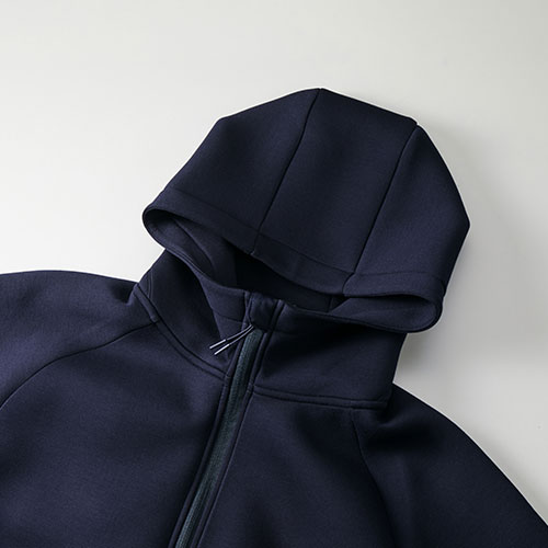 「スポーツシーンでさっと羽織って使いたい!」「スポーツミックスの街着に新しい選択肢が欲しい!」そんな要望を叶えるバーサタイルなパーカ。最大の特徴は、多重構造のダンボールニット生地。3層を繋ぎ合わせた生地は空気の層ができることにより保温性にすぐれ、軽くてシワになりにくく、ストレッチ性も兼ね備えています。