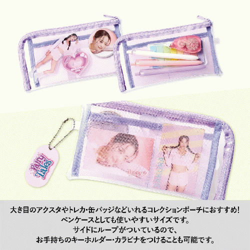 また中身が見えるクリアポーチ部分にはお気に入りのコレクションをかわいくデコレーションして楽しむこともできます。