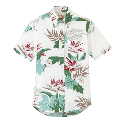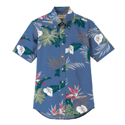 様々な種類のリーフ柄を用いた清涼感溢れる仕上がりのアロハシャツです。襟元はボタンダウン仕様のため、きちんと感も演出できます。