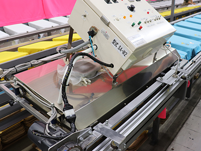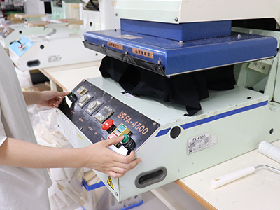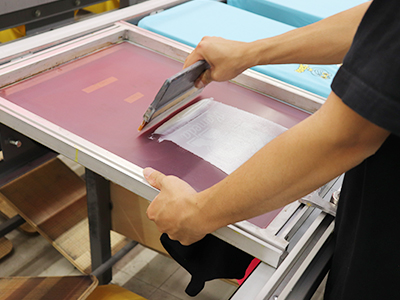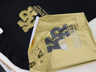 生地に接着用インクをプリントし、その上から箔と呼ばれる特殊なホログラムシートを圧着する加工方法。