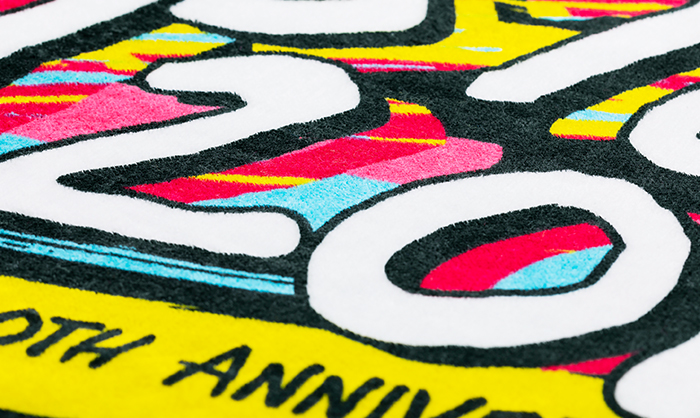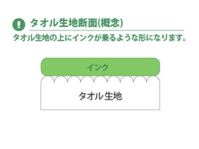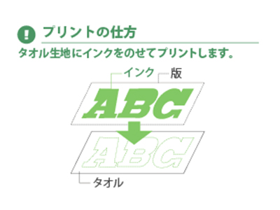 顔料インクに接着剤の役目となる合成樹脂液をまぜて、タオルの表面にプリントします。